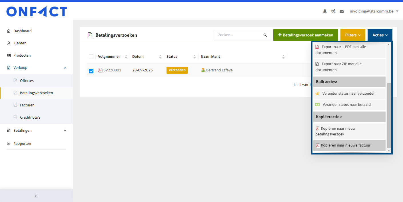 Een betalingsverzoek kan eenvoudig gekopieerd worden naar een factuur. Vanuit het overzicht van betalingsverzoeken kan je een verzoek aanvinken. Via de blauwe knop 'Acties' zie je welke mogelijkheden er zijn; de onderste actie is 'Kopiëren naar nieuwe factuur'.&#x20;