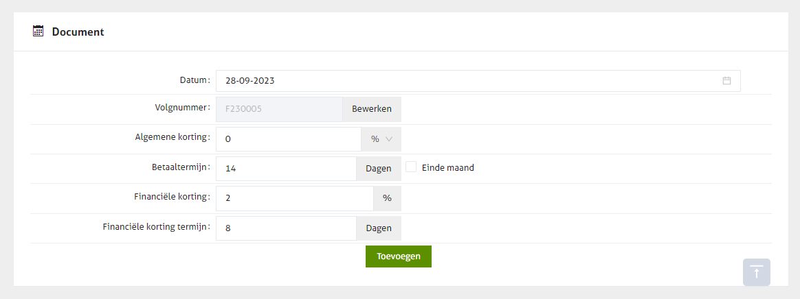 In dit voorbeeld zal de klant van 2% korting kunnen genieten indien hij binnen de 8 dagen de factuur betaalt. Wordt er na acht dagen betaald, dan vervalt de korting.