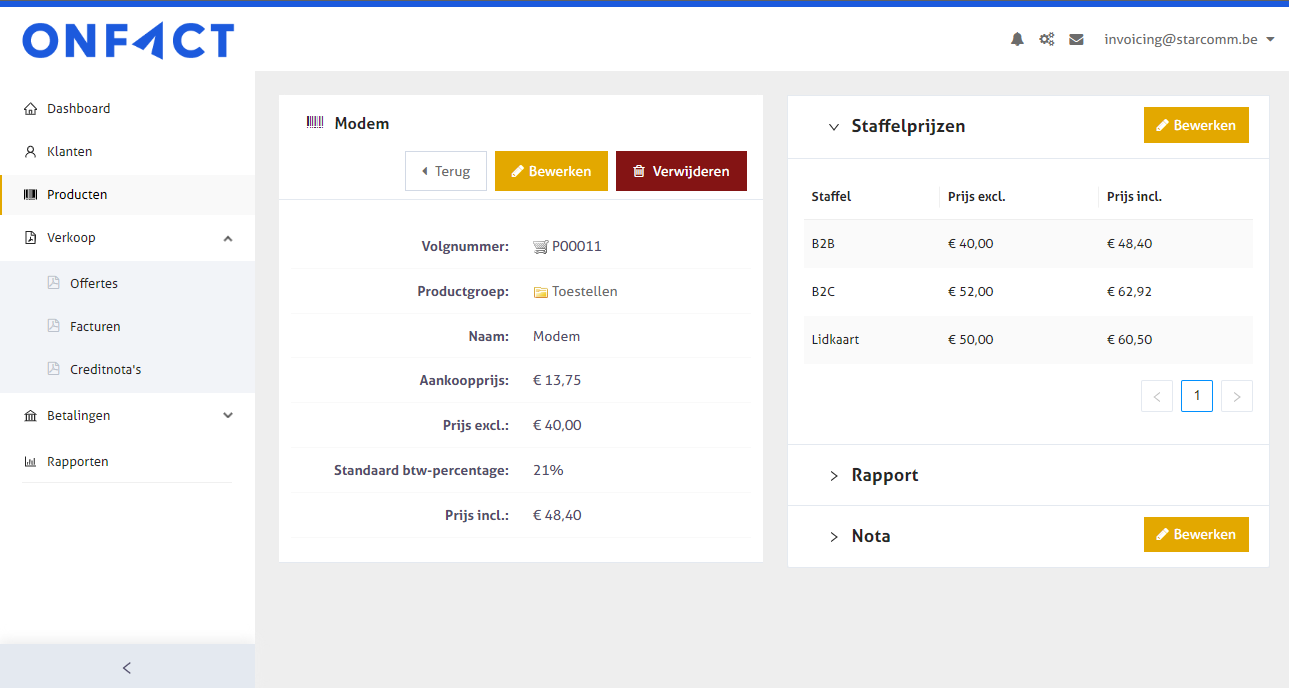 Het is mogelijk om per type klant een korting toe te kennen of andere prijs te hanteren. Dit wordt in onFact beheerd via staffelprijzen (lees hier meer over staffelprijzen).