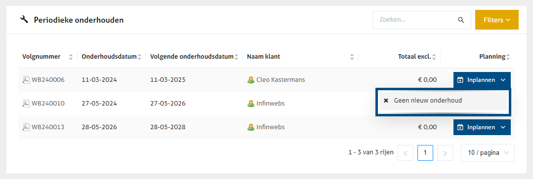 In je overzicht van periodieke onderhouden verschijnen de klanten die via een werkbon reeds werden gelinkt aan een onderhoud. Ook via dit overzicht kan je een eventueel toekomstig onderhoud annuleren.&#x20;