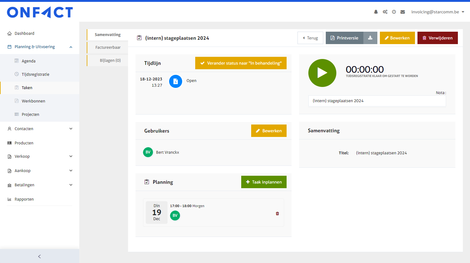 Vanuit het samenvattingsscherm kan je een tijdsregistratie starten. Zie de sectie omtrent '[Tijdsregistratie](https://documentatie.onfact.be/apps/tijdsregistratie)' voor meer informatie.
