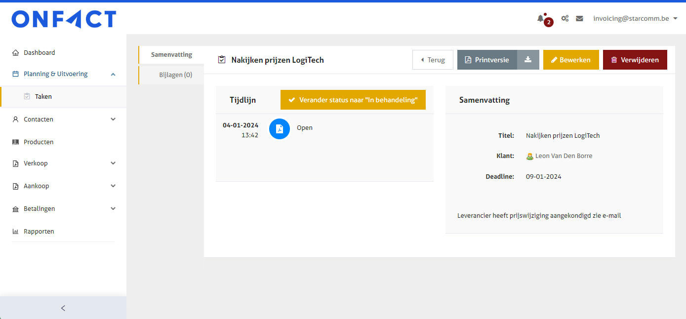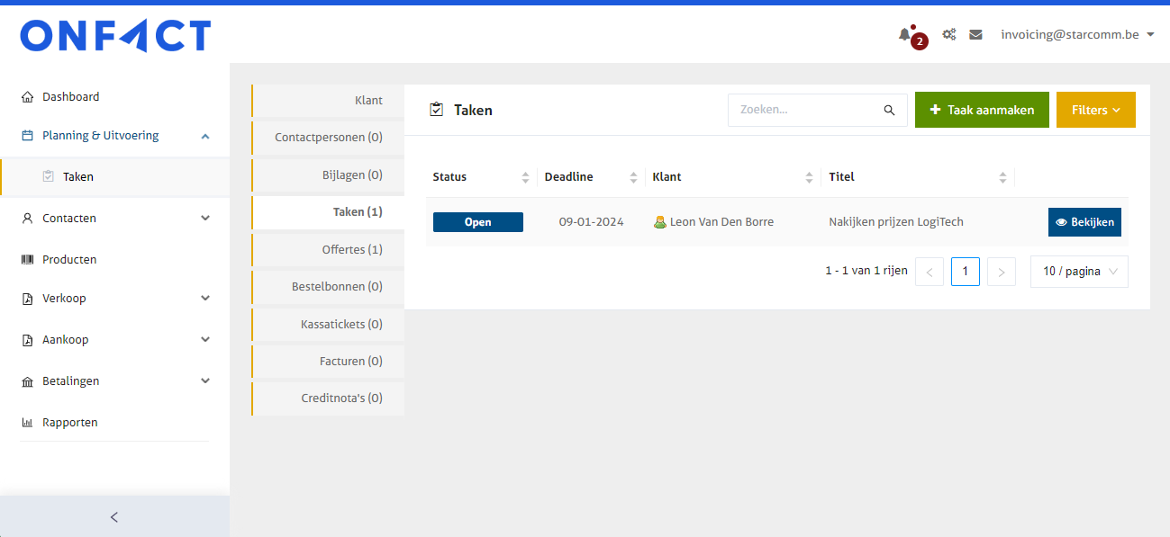De taak wordt automatisch gekoppeld aan de klant aan wie de offerte gericht werd. In het overzicht van de taak staat ook een link naar de offerte, zodat deze makkelijk terug opgeroepen kan worden.
