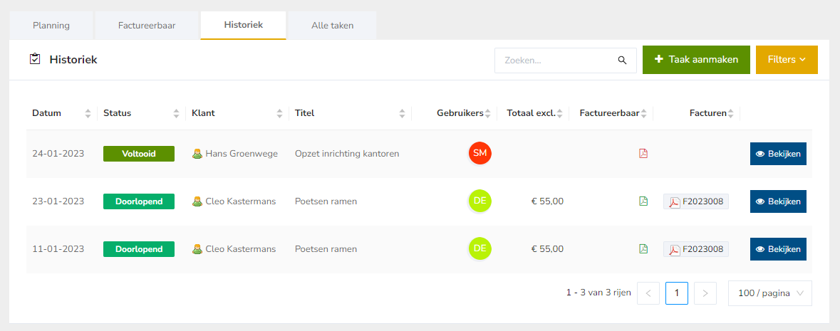 In de tab 'Historiek' zie je een overzicht van alle taken die in het verleden liggen.&#x20;