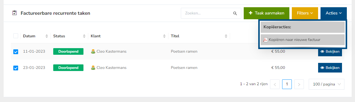 Deze recurrente taken kan je dan bundelen in één, bv. maandelijkse factuur. Zo vermijd je dat bv. wekelijkse of tweewekelijkse taken telkens een individuele factuur krijgen (minder administratie).&#x20;