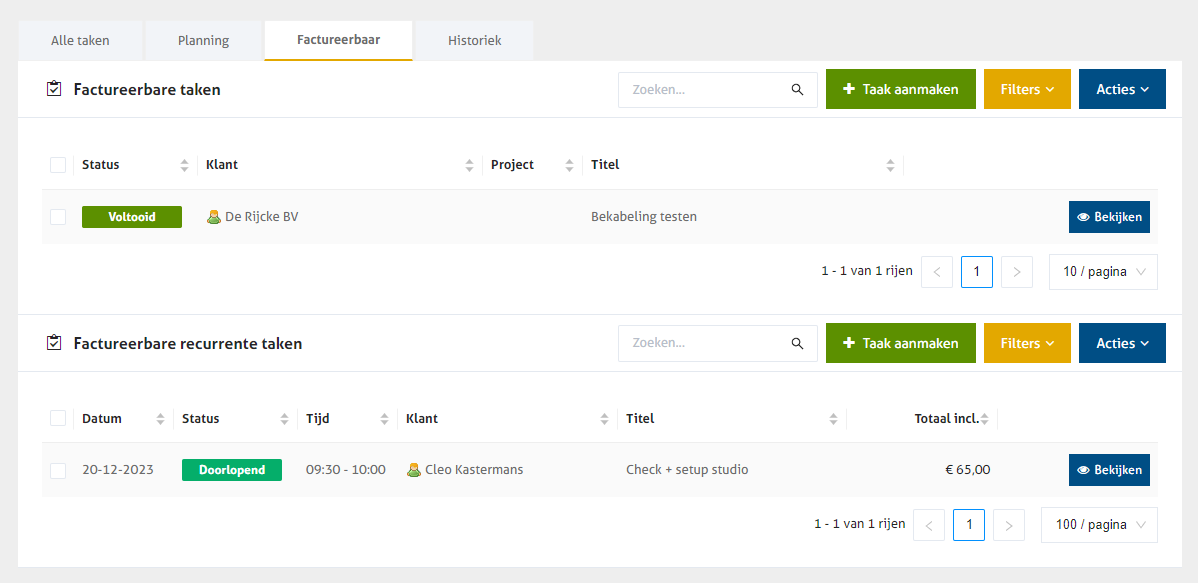 Onder de tab 'Alle taken' krijg je een overzicht van alle taken, ongeacht of ze een datum kregen (ingepland zijn/waren) of niet. Dankzij de kolom 'Factureerbaar' kan je ook hier nogmaals opvolgen welke taken je reeds gefactureerd hebt.&#x20;