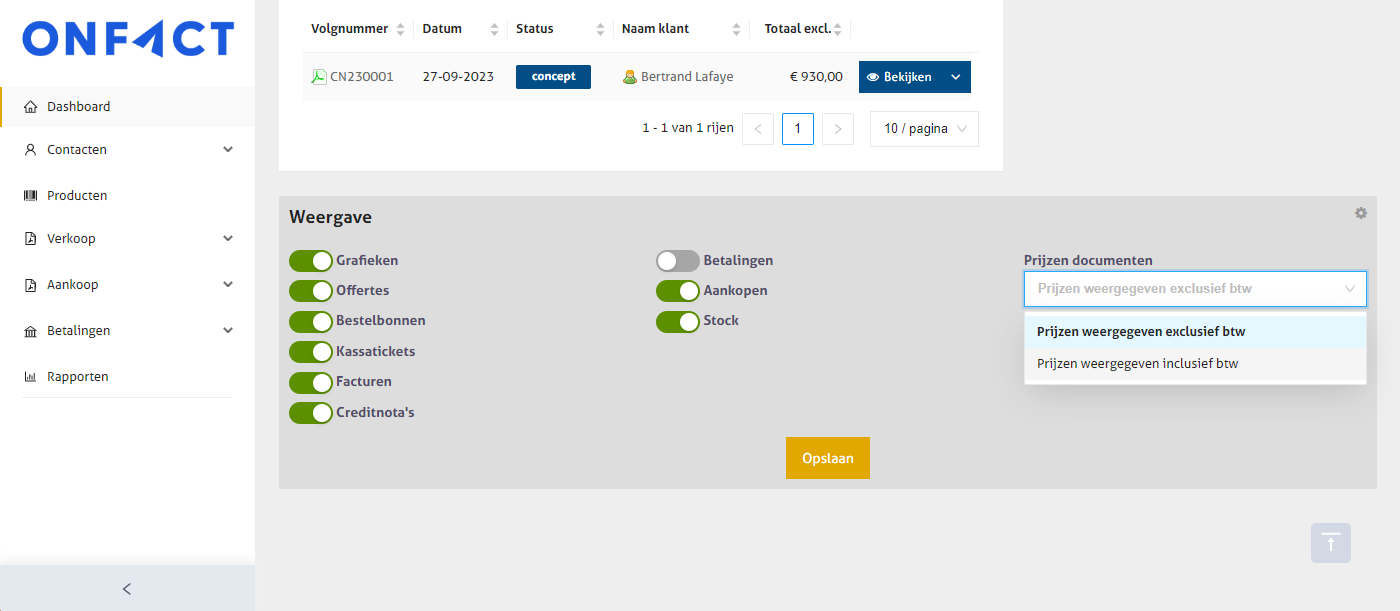 Je kan de aanwezige widgets aan- of uitschakelen en bepalen of weergegeven prijzen in- of exclusief btw verschijnen. Klik op 'Opslaan' om je settings te bewaren.