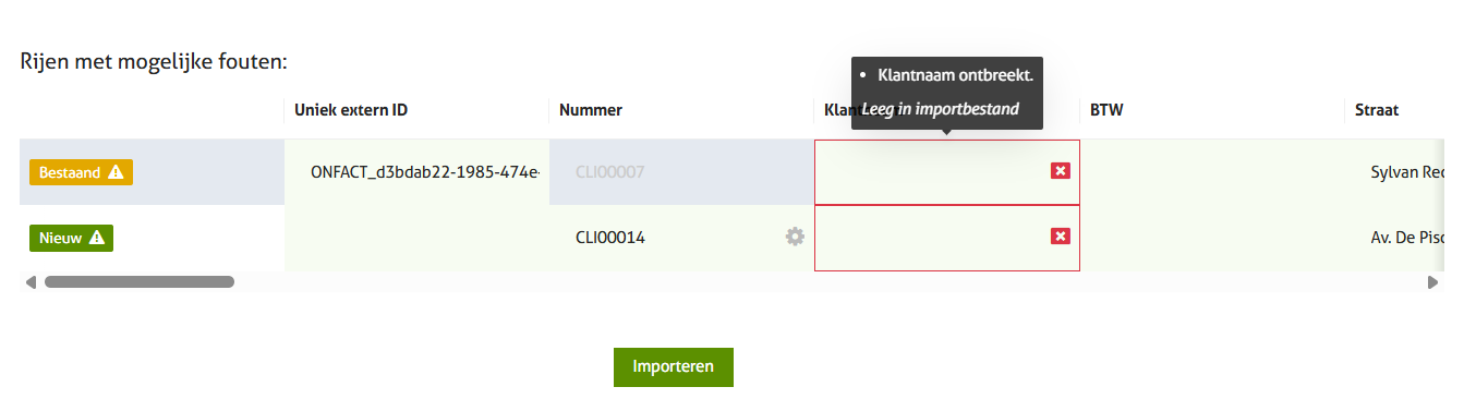 Het is ook mogelijk dat onFact een 'Foutmelding' toont. Dit is het geval wanneer bv. een verplicht veld, niet aanwezig is. Dit is bijvoorbeeld het geval bij een ontbrekende klantnaam. Wil je dan 'Importeren', zal dat niet mogelijk zijn en moet je deze waarde(n) eerst in je importbestand aanvullen.