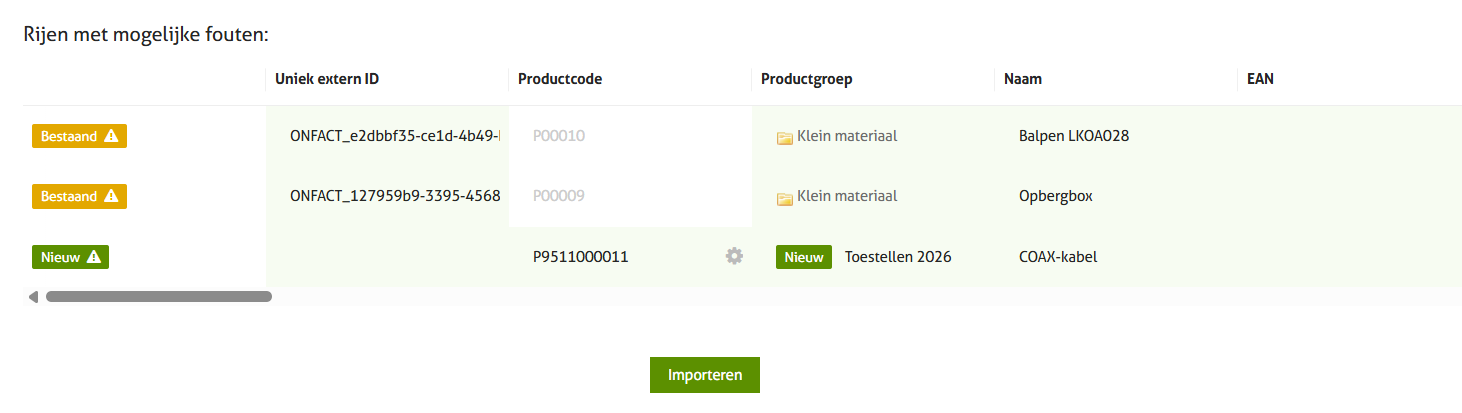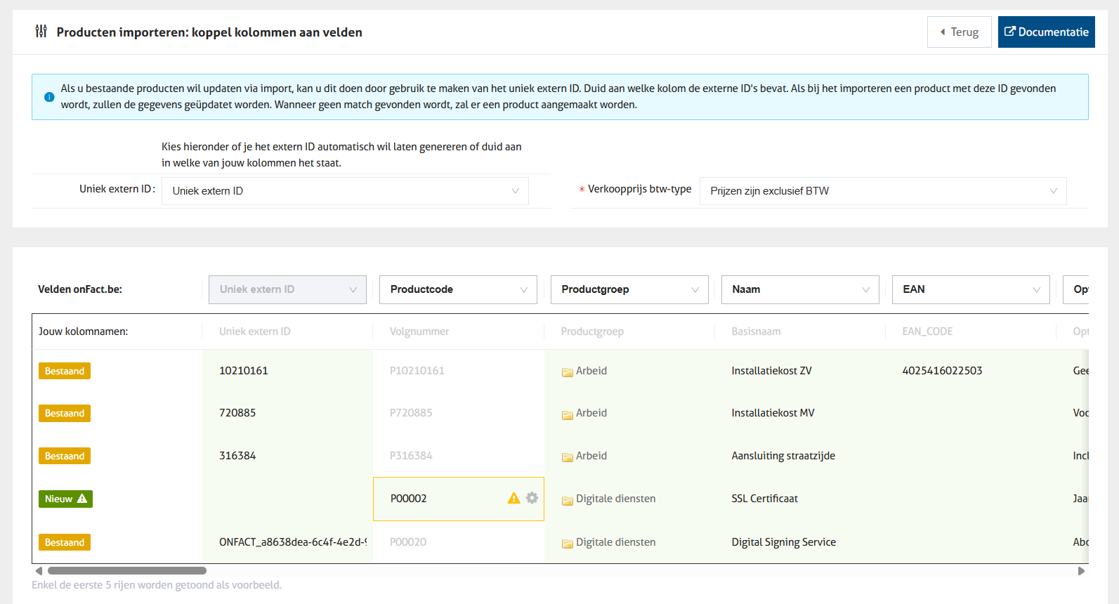 Het toewijzen van een Uniek Extern ID kan enkel gebeuren bij een eerste import! Zodra data in je onFact-productenlijst bestaat, kan het Uniek Extern ID niet meer gewijzigd worden. Ken je zelf geen Uniek Extern ID toe? Dan zal onFact zo'n ID aanmaken.