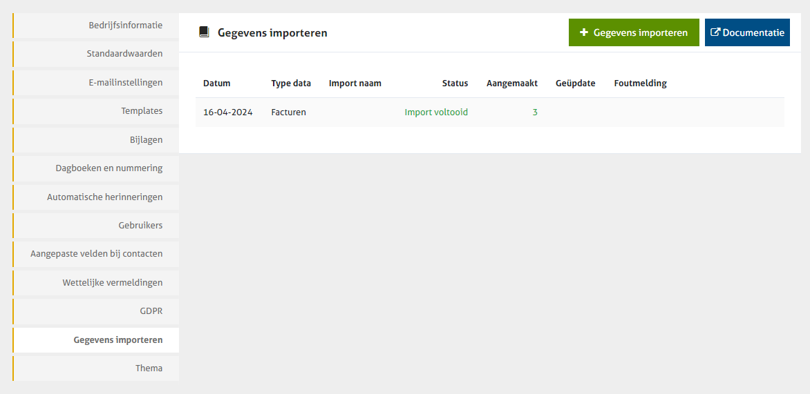 * Ga naar 'Gegevens importeren' en klik rechtsboven op de groene knop 'Gegevens importeren'.