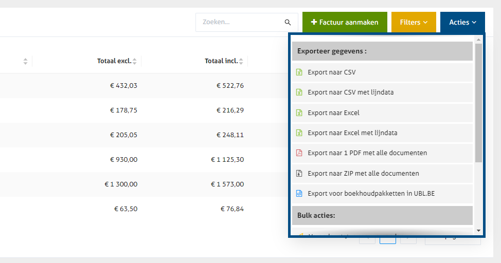 ### Stap 1. Facturen, aankopen of creditnota's exporteren in UBL