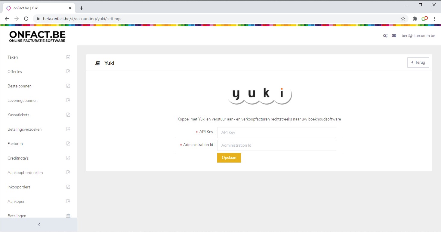 onFact zal je nu voor de koppeling met Yuki om een 'API Key' en 'Administration ID' vragen.