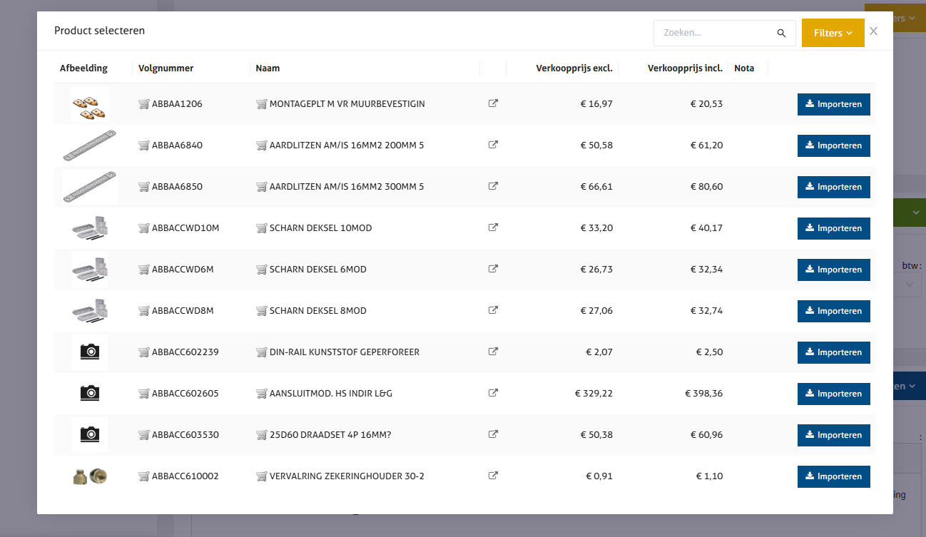 Via het zoekveld rechtsboven kan je een artikel opzoeken. Klik op het icoon met uitgaand pijltje om het item te bekijken op de website van Rexel. Klik op de blauwe knop 'Importeren' om het product toe te voegen aan je document.