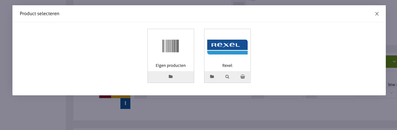 Je kan producten selecteren uit je eigen productlijst, of uit de lijst van Rexel. Onder het Rexel-logo staan drie knoppen: