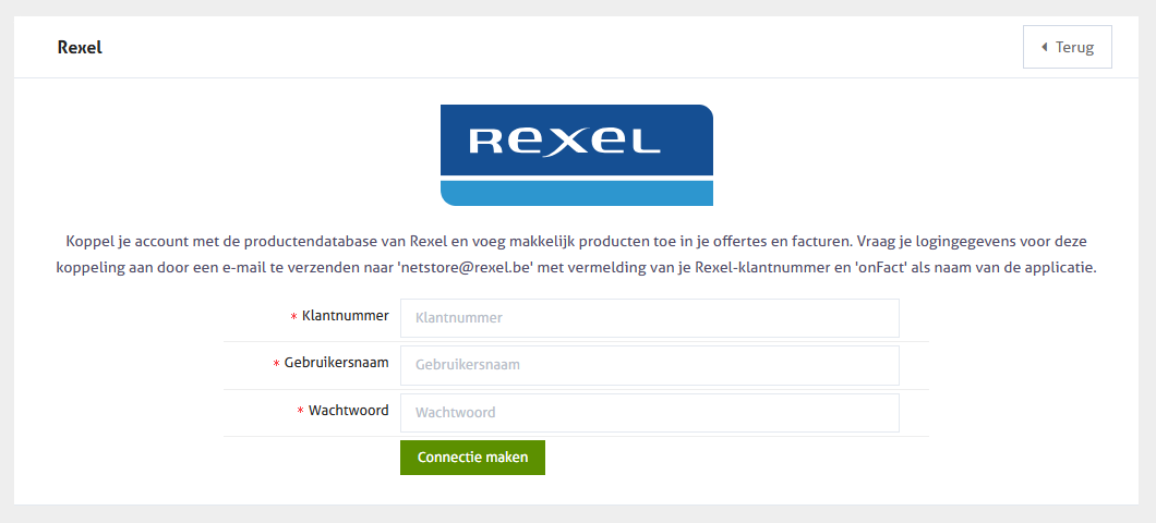 Vraag je logingegevens voor deze koppeling aan door een e-mail te verzenden naar '**<netstore@rexel.be>**' met vermelding van je Rexel-klantnummer en 'onFact' als naam van de applicatie waarmee je wil verbinden.