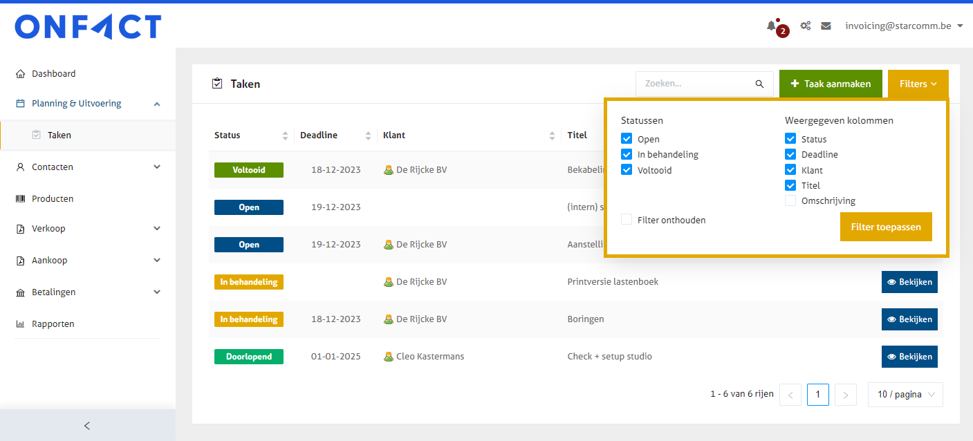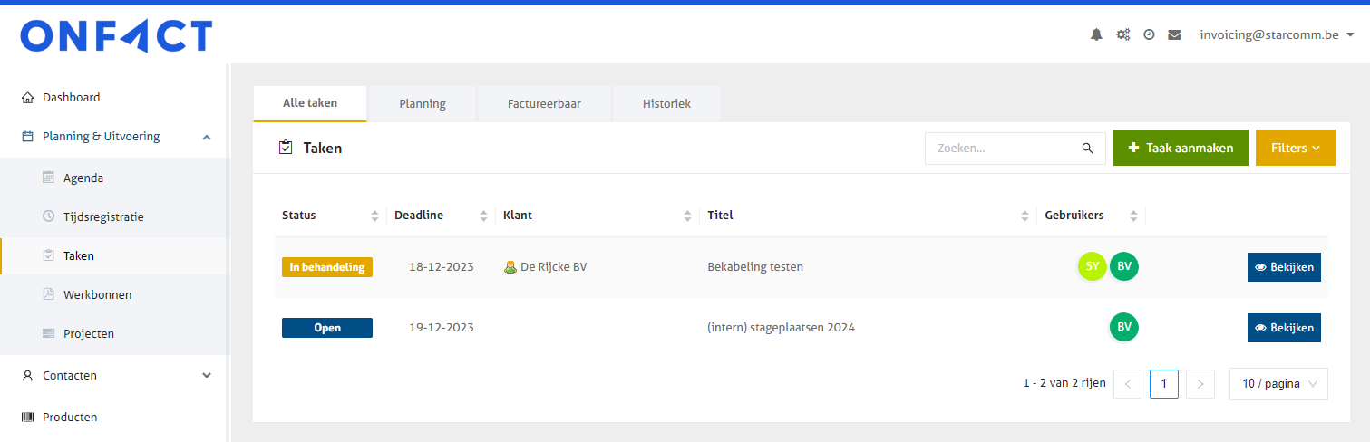 Heb je een '[Premium](https://www.onfact.be/prijzen)' abonnement? Dan is je Taken-module meer uitgebreid. [Lees hier meer over onderaan de pagina](#taken-in-premium-abonnement).&#x20;