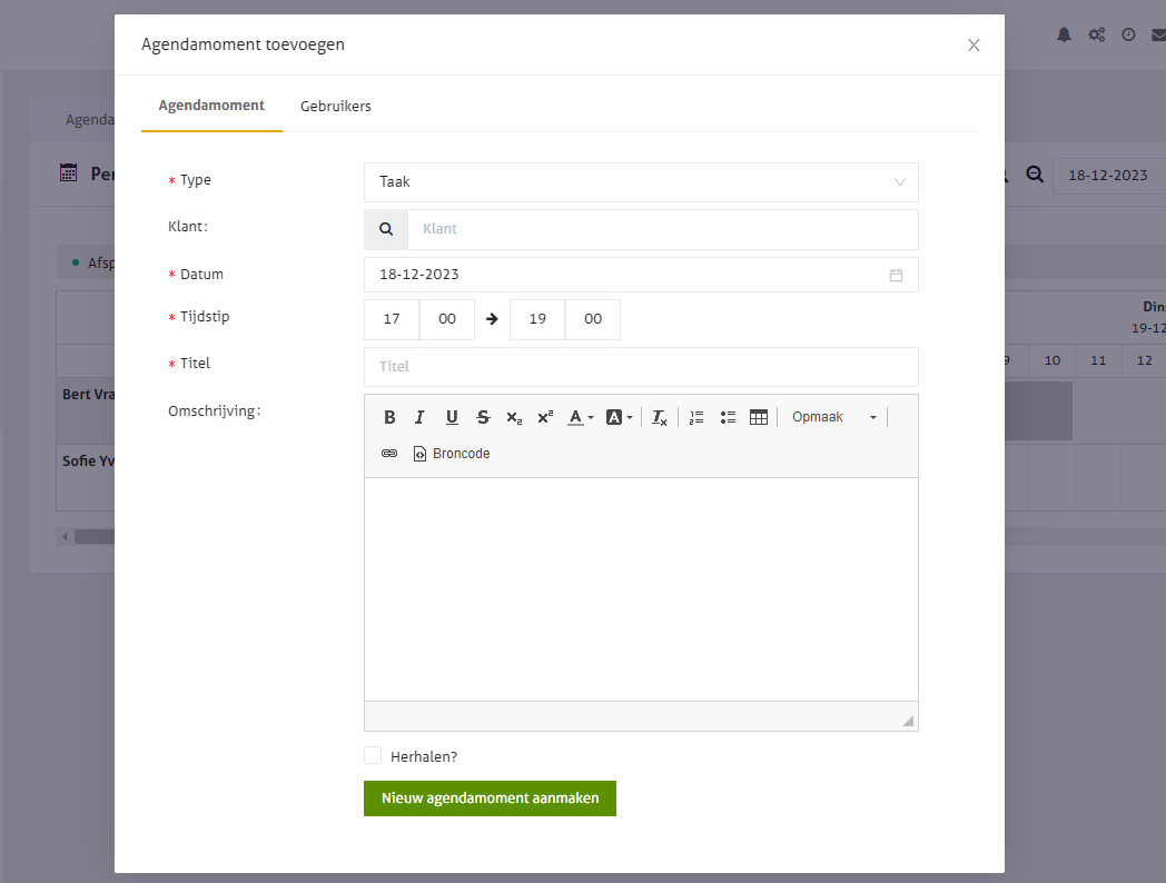 Klik op 'Nieuw agendamoment aanmaken' om de taak aan te maken en in te plannen.