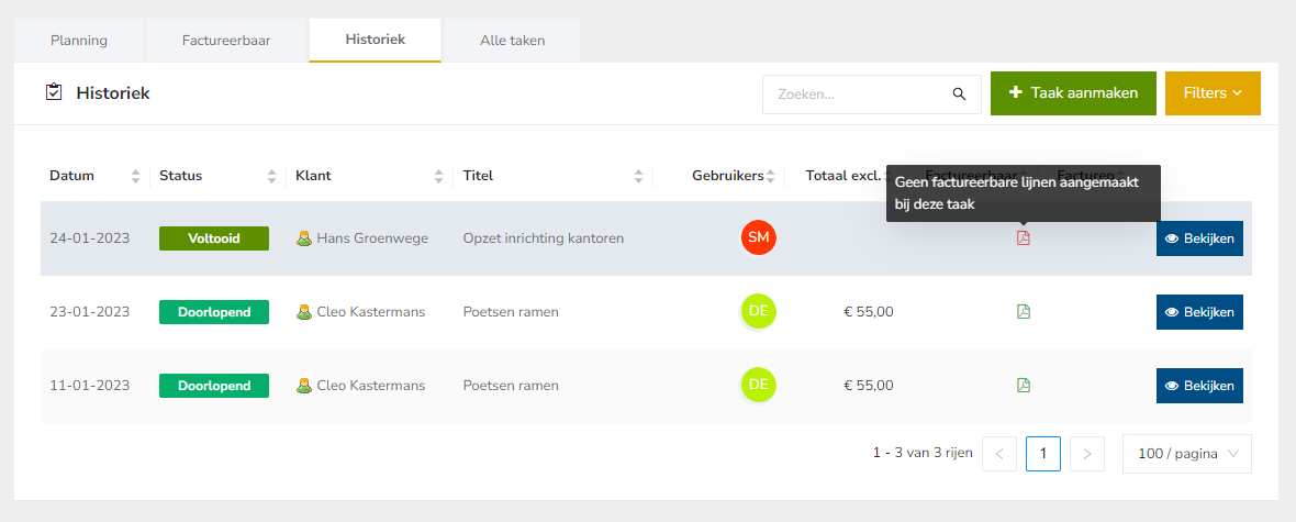 In de tab 'Historiek' zie je een overzicht van alle taken die in het verleden liggen.&#x20;