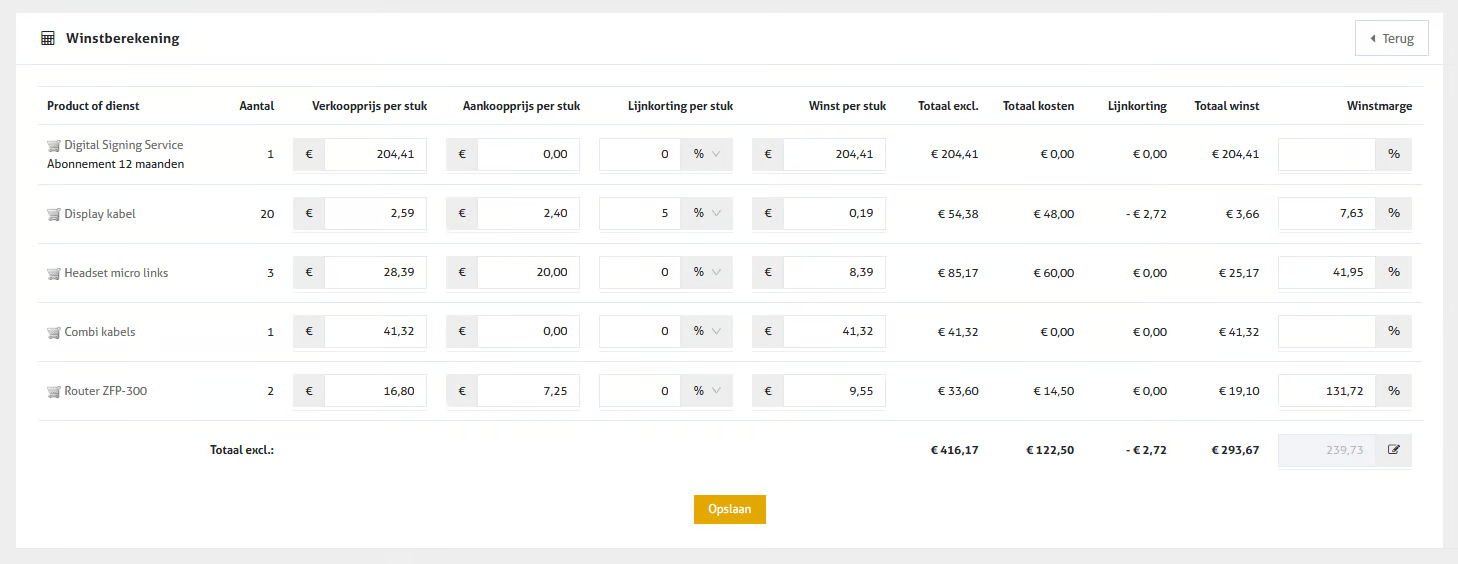 In de winstberekening-tab wordt elke documentlijn bewerkbaar: door aanpassingen in bv. 'Aankoopprijs', 'Lijnkorting' en 'Winstmarge' kan je de vermelde bedragen (laten) wijzigen.&#x20;