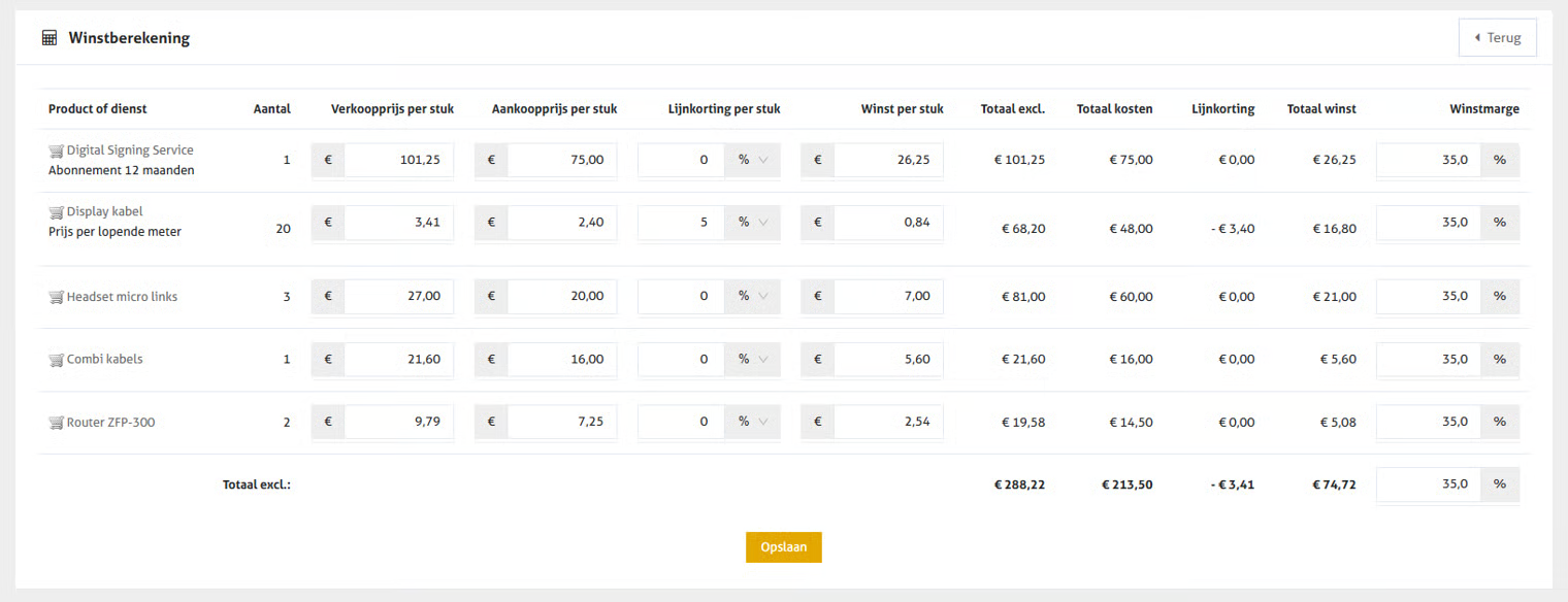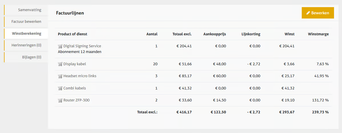 In de tab 'Winstberekening' kan je op basis van de ingevoerde verkoopprijzen en/of opgehaalde aankoopprijzen uit de productfiches, je totale winst op het document nog bewerken. Klik daarvoor op de gele knop rechtsboven. Deze tab is beschikbaar bij documenttypes 'Offertes' en 'Facturen'.&#x20;