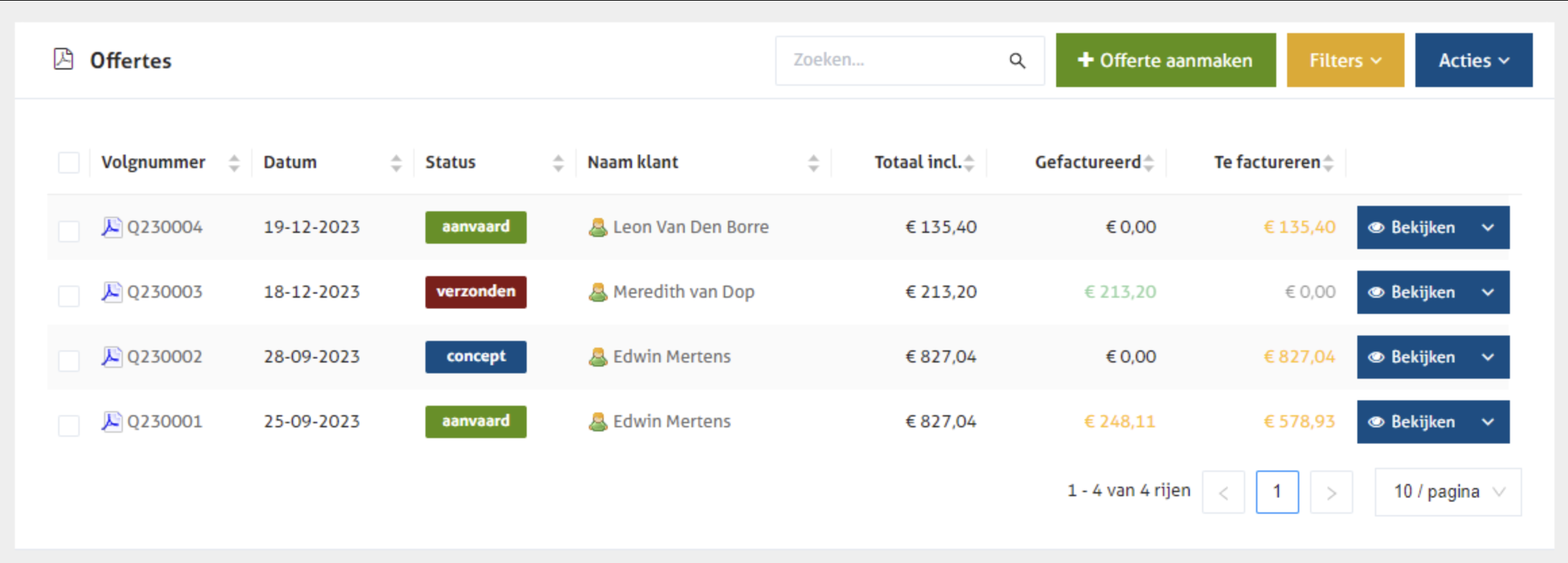 Via de gele knop 'Filters' kan je extra velden 'Gefactureerd bedrag' en/of 'Te factureren' zichtbaar maken. Op die manier zie je meteen voor welke bedragen er reeds (voorschot)facturen werden aangemaakt vanuit een offerte:
