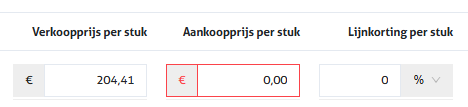 In het voorbeeld hierboven is niet voor elk product/dienst een aankoopprijs ingevoerd. In dat geval kan er geen winstmarge ingevoerd worden. Bij invoer in het vak 'Winstmarge' moet het vak 'Aankoopprijs' verplicht aangevuld worden: