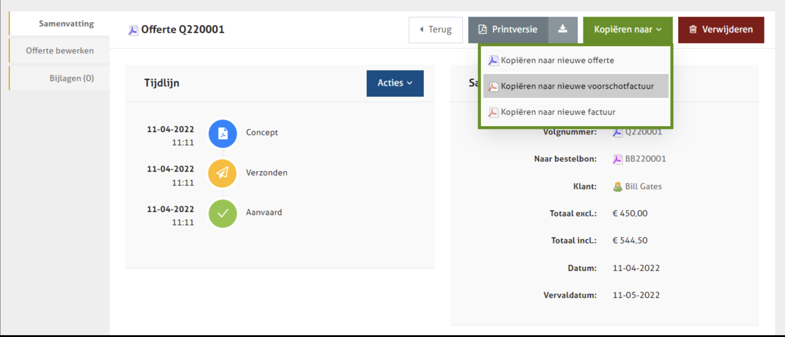 Als je offerte gemaakt is, zijn er functies beschikbaar via de blauwe 'Actie' knop en de groene 'Kopiëren naar' knop.&#x20;