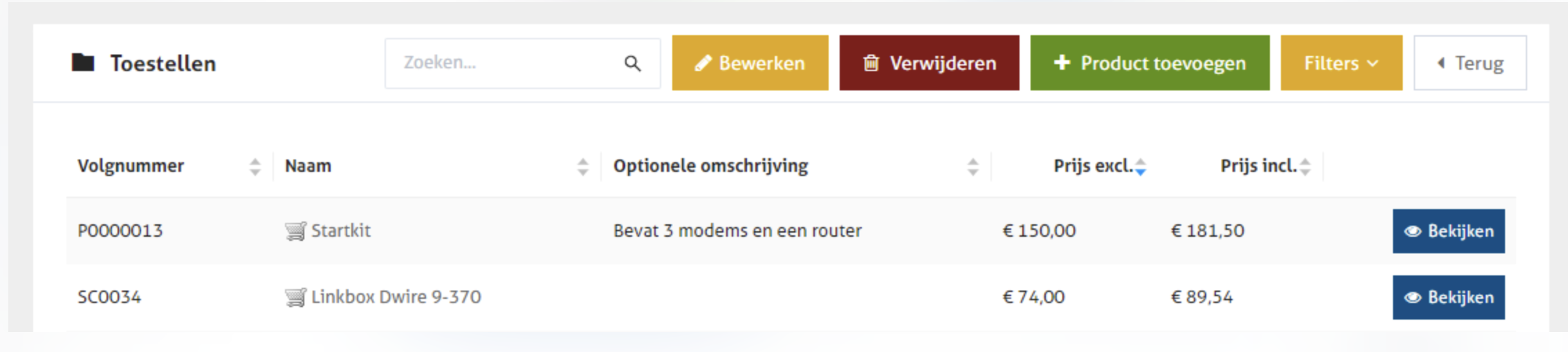Meteen een overzicht van al je producten, ongeacht hun productgroep? Klik dan rechtsboven op de blauwe knop 'Volledige productlijst'.