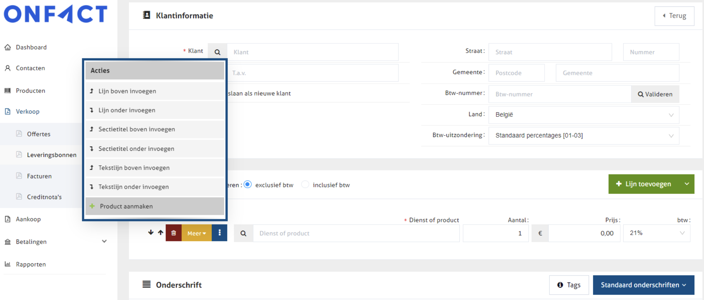 Bij het aanmaken van een document verschijnen er een aantal productlijnen. In deze vakken kan je de basis productinformatie invoeren. Aan de linkerkant van een productlijn verschijnt een blauwe knop. Klik er op om een keuzemenu te openen.