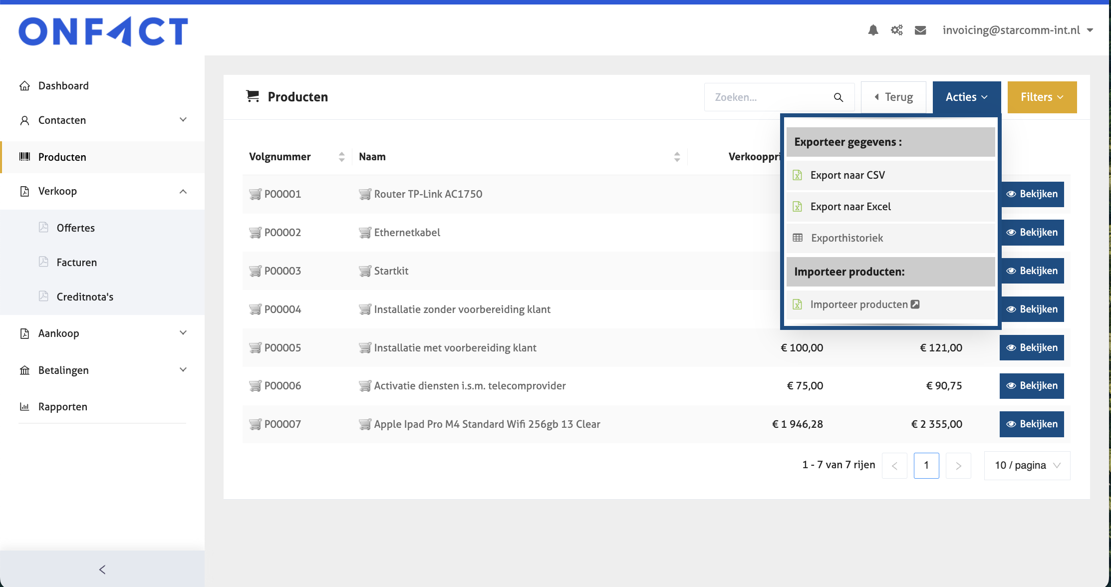 Je kan ook makkelijk vanuit onFact je ingevoerde producten exporteren.