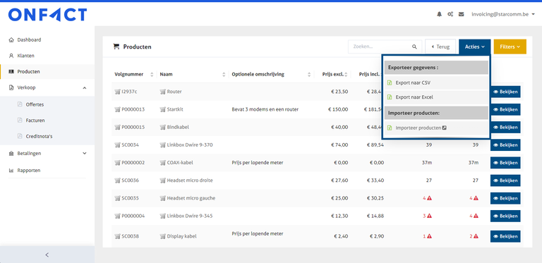 Om te exporteren ga je in de productlijst rechtsboven naar de blauwe knop 'Acties'. Je kiest er voor de 'Export naar CSV / xlsx (Excel)'.&#x20;