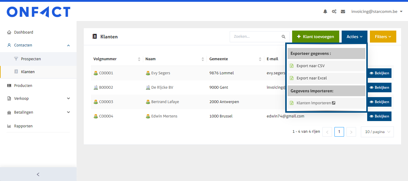 Om te exporteren ga je in het klantenoverzicht rechtsboven naar de blauwe knop 'Acties'. Je kan er exporteren naar een csv- of Excelbestand.
