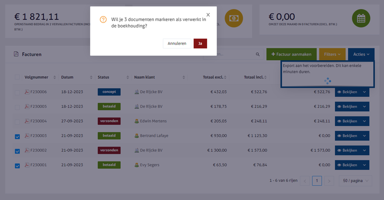Als je een selectie documenten aanduidt en deze via de blauw knop 'Acties' rechtsboven wil exporteren naar UBL, zal er een mededeling verschijnen: *"Wil je xx documenten markeren als verwerkt in de boekhouding?".*&#x20;