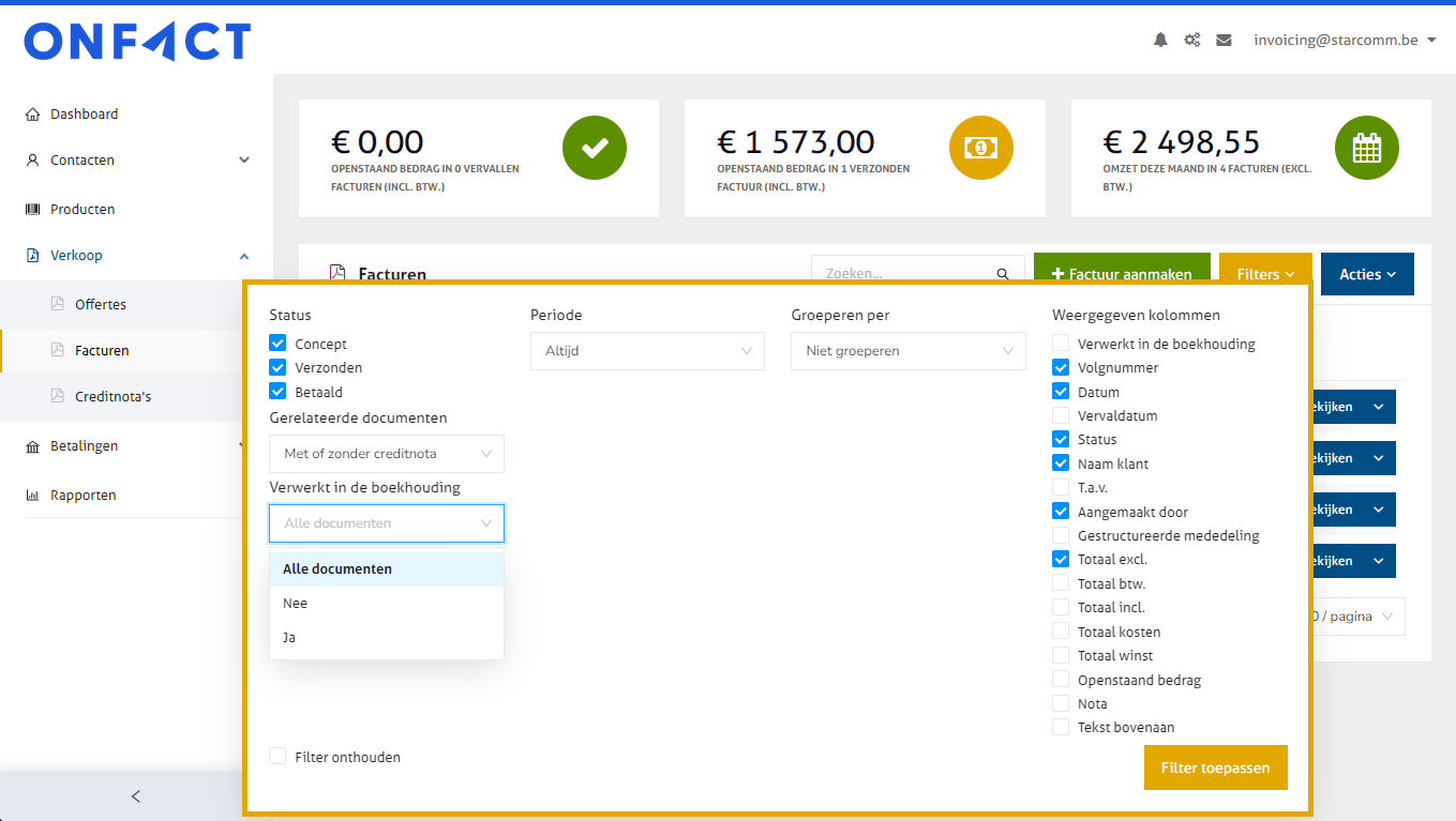 Let op: als je geen bepaalde documenten selecteert (bv. vinkje links naast factuurnummer), zullen de exports gemaakt worden op basis van **alle** documenten (bv. alle offertes, alle facturen, ...). Wens je enkel een bepaalde selectie te exporteren, duid dan op voorhand een selectie aan op basis van de gele knop 'Filters'.