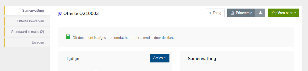 Een meer correcte manier om een aanvaarde offerte te wijzigen/bij te werken is de bestaande offerte te kopiëren naar een nieuwe offerte, en deze opnieuw te laten ondertekenen.